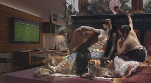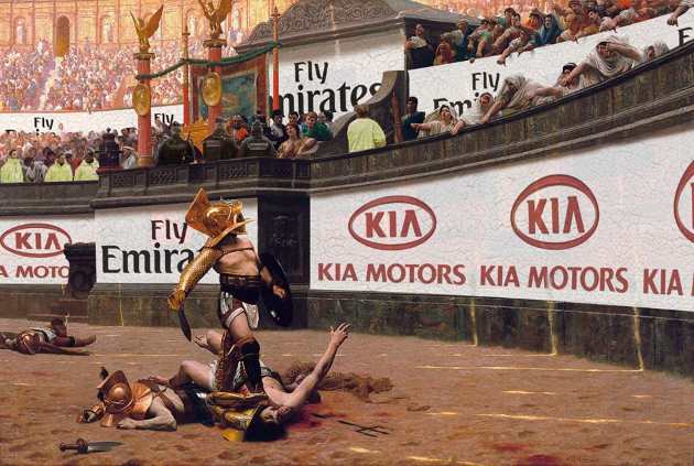 Ces anachronismes sont réalisés avec beaucoup de soin et le rendu est épatant : on pourrait presque croire à l’authenticité des images. Et quand ce designer s’amuse à décorer une arène avec des sponsors à l’image d’un stade de foot, le résultat est à nouveau très réussi.