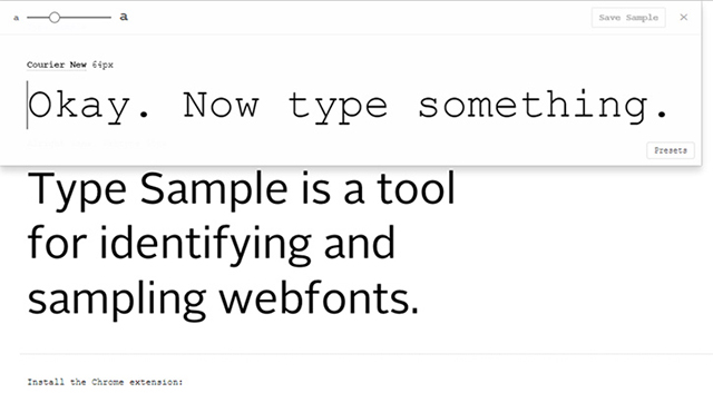 Type Sample est une solution web relativement minimaliste. Ce site offre une extension du moteur de recherche Chrome qui fonctionne plutôt bien, mais leur atout principal est leur bookmarklet (marque-page) en JavaScript. Si vous sélectionnez et faites glisser leur lien « Type Sample » dans votre barre d’outil marque-page, cela créera un bookmarklet, qui se comportera comme un applet (microprogramme) écrit en JavaScript. Grâce à cet applet, les polices d’un site peuvent être identifiées instantanément.