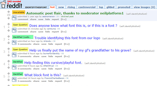 En terme de trafic, Reddit est sans aucun doute la communauté la plus diversifiée. Le site se compose de mini forums appelés « subreddits » se consacrant chacun à un sujet en particulier. Identify This Font est l’un de ces sous-forums, et avec plus de 3000 membres, vous êtes certain de d’obtenir une réponse en moins de 48h.