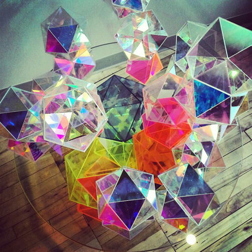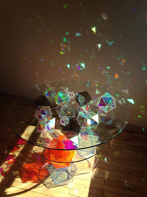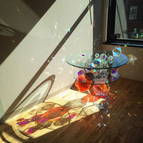 Le designer John Foster, basé à Minneapolis aux Etats-Unis, a créé cette superbe table dont les angles de verres colorés permettent à la lumière d’éclater en centaines de particules angulaires grâce à l’interaction du soleil. Le dessus de la table est placé sur une succession de pyramides inversées de cristaux, qui projettent la lumière selon des centaines de petits arc-en-ciels, sur les murs et le sol.